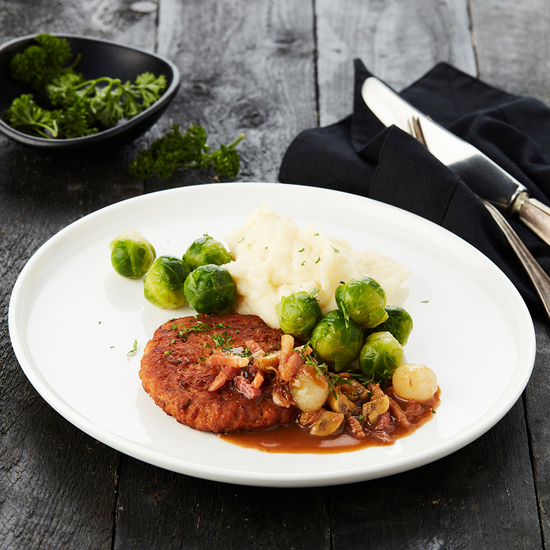 Gebakken hamburger met een jagersaus vergezeld van gestoofde spruiten en aardappelpuree.