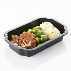 Ingrediënten: Aardappelpuree met hoeveboter 38 % (Aardappelen (81,3%), melk, boter (4.2 %), zout, nootmuskaat, peper), Spruiten 27 % (spruitjes, ajuin (ajuin, olie (koolzaadolie, boteraroma), zout, natriumbicarbonaat, peper)), Spek (varkensvlees, water, zout, glucosestroop, antioxidant (natriumerythorbaat), conserveermiddel (natriumnitriet, kaliumnitraat, rook))), Olie (koolzaadolie, boteraroma), zout, peper)), Hamburger 19 % (varkensvlees (64,2%) rundvlees (27,5%), ei (voedingszuur : citroenzuur), kruiden (zout, specerijen, soja-eiwitten, aroma (melk)), bindmiddel ( soja-eiwitten, plantaardige olie (paprika)), kruidenmix: (paneermeel (tarwebloem, zout, rijsmiddel : ammoniumcarbonaat),vezels, zetmeel, eiwit, dextrose, aroma)), Koolzaadolie), Jagersaus 15 % (water, rode wijn (bevat sulfiet), champignons , ajuin, spek , (varkensvlees , water, zout, glucose, antioxidant (natriumerythorbaat), conserveermiddel (natriumnitriet), kaliumnitraat, rook), zetmeel, vleesbouillon, geroosterde kalfsbotten, geroosterde groenten, knoflookpuree, gistextract, kalfsvleesextract, geconcentreerde tomaat, zetmeel, weipermeaat, gemodificeerd zetmeel, plantaardig vet (gedeeltelijk gehard palmvet, palmvet), gehydrolyseerd plantaardig eiwit (soja), tarwe bloem, plantaardige olie (koolzaad, zonnebloem), suiker, witte wijnazijn, zout, kruiden, specerijen, aromas (bevat tarwe, selder, melk, soja), emulgator (mono- en diglyceriden van vetzuren), kleurstof (karamel, ammoniakkaramel), stabilisator (sorbitol), voedingszuur (azijnzuur), smaakversterker (mononatriumglutamaat), verdikkingsmiddel (guargom), Peterselie