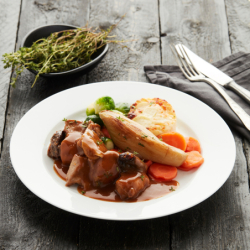 Stoofpotje van konijn vergezeld van worteltjes met tijm, gebakken witloof en spruiten op smaak gebracht met gestoofde ajuin, zwarte peper en zeezout afgewerkt met aardappelgratin.
