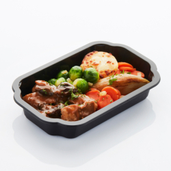 Ingrediënten: Stoofpotje van konijn 39 % (Saus 50 % (Water, Bier (water, gerstemout, rijst, hop, natriumsaccharine, ascorbinezuur, kleurstof: karamel), Luikse siroop (geconcentreerd sap van gekookte peren, geconcentreerd sap van gekookte appels, geconcentreerd sap van gekookte dadels, witte kristalsuiker (35 %), citroenzuur), Roux (tarwebloem, palmvet, kleurstof (ammoniakkaramel)), Vleesbouillon (zout, maltodextrine, suiker, palmvet, rundvleesextract (4,2%), aromas (melk), gistextract, geroosterde ui, geconcentreerd uiensap, karamelstroop, specerijen (kurkuma, wortelpeterselie), zonnebloemolie), Stoofvleessaus (gemodificeerd zetmeel, maïszetmeel, plantaardig vet (geheel gehard palmvet), aromas (soja, sulfiet, selder), zout, suiker, ajuinconcentraat, verdikkingsmiddelen (guarpitmeel, xantaangom), gistextract, smaakversterkers (mononatriumglutamaat, natriumguanylaat, dinatriumionisaat), maltodextrine, kleurstof (amoniakkaramel, paprika-extract), groentenpoeder (ajuin, tomaat), plantaardig eiwithydrolisaat (soja), kruiden- en specerijenextracten, zonnebloemolie, voedinsgzuur (melkzuur)), Mosterd (water, mosterdzaden, azijn, zout, specerijen), bruine suiker, kruidnagel, Zout, Peper, Tijm), Konijn 39 %, Ajuin 5 %(ajuinschijven, koolzaadolie), Pruimen 5 %), Aardappelgratin 19.5 % (aardappelen, room 45%, Emmentaler kaas 7%, zout, stabilisator (methylcellulose), natuurlijk knoflookaroma, specerijen), Spruiten met spekreepjes 14.5 % (Spruitjes, Ajuin (Ajuin, Olie (Koolzaadolie, Boteraroma), Zout, Natriumbicarbonaat, Peper), Spek (Spek (varkensvlees (88%), water, zout, glucosestroop, antioxidant (natriumerythorbaat), conserveermiddel (natriumnitriet, kaliumnitraat, rook))), Olie (Olie (Koolzaadolie, Boteraroma), Zout, Peper)), Wortelschijfjes met tijm 14.5 % (Wortel, Ajuin, Olie (Koolzaadolie, Boteraroma), Zout, Dextrose, Peterselie, Nootmuskaat, Peper, Thijm), Witloof mini gebakken 11 %(Witloof, Koolzaadolie), Peterselie.