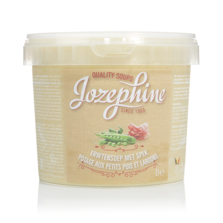 Ingrediënten: Erwtensoep (Water, Erwten 6.5 %, Knolselder (knolselder), Ajuin, Erwtensoep (Groenten (erwten (48%), ui, spinazie), roux (tarwebloem, palmvet), zout, gemodificeerd aardappelzetmeel, smaakversterkers (MSG, natriumguanylaat, natriuminosinaat), katenspek (varkensvet, rookaroma), maltodextrine, spekstukjes (varkensvlees, zout, rookaroma), aromas (bevat selder), verdikkingsmiddel (guargom), ham (varkensvlees, zout, dextrose, antioxidant (alfa-tocoferol, ascorbylpalmitaat)), gistextract, specerijen (nootmuskaat, selderijzaad), rookaroma, palmvet), Bindmiddel (tarwebloem, gedeeltelijk gehard palmvet, rijstemeel, aardappelzetmeel, verdikkingsmiddel (guarpitmeel), emulgator (lecithine)), Selder (selder), Room (room , melkeiwitten, gemodificeerd maïszetmeel, stabilisatoren (carrageen, cellulosegom), emulgatoren (mono- en diglyceriden van vetzuren, mono- en diglyceriden van vetzuren veresterd met melkzuur)), Kippenbouillon (zout, maltodextrine, gistextract, aroma's, suiker, kippenvet 3% (kippenvet, antioxidant (rozemarijnextract)), ui, karamelstroop, specerijen (kurkuma, pepper), kippenvlees 0,1% (kippenvlees, zout, antioxidant (rozemarijnextract))), Prei), Spek 2 % (varkensvlees (88%), water, zout, glucosestroop, antioxidant (natriumerythorbaat), conserveermiddel (natriumnitriet, kaliumnitraat, rook))